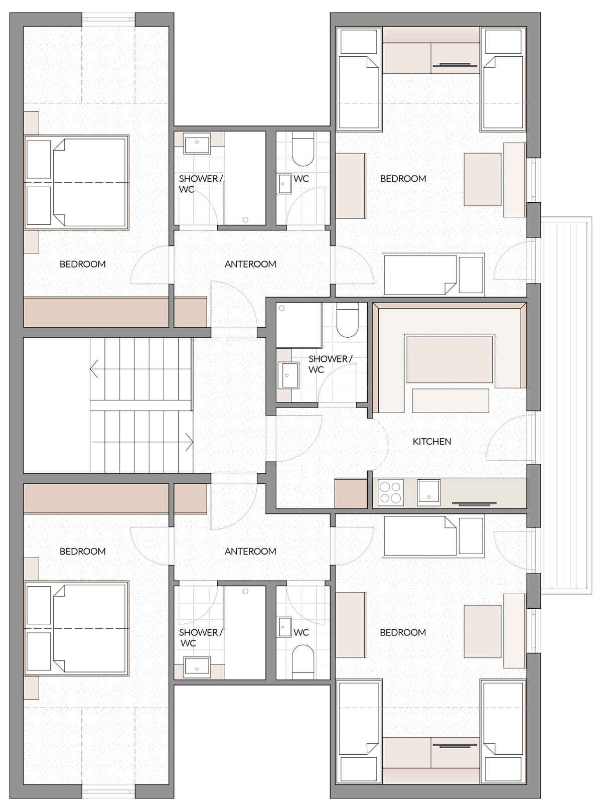 Our largest apartment extends over the entire top floor and has 2 separate living units for 4-5 persons. There is a central kitchen-dining area accessed from both apartments.